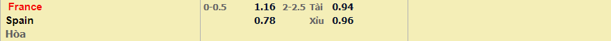 - Mức kèo nhà cái cược chấp trận này: Pháp chấp 0,25 Trái. Pháp ăn 1,16. Tây Ban Nha ăn 0,78