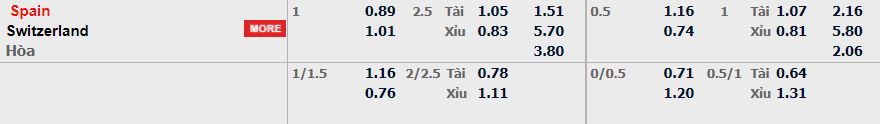 - Mức kèo nhà cái cược chấp trận này: Tây Ban Nha chấp 1 Trái. Tây Ban Nha ăn 0,89. Thụy Sĩ ăn 1,01