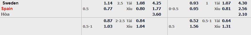 - Mức kèo nhà cái đưa ra trận này: Tây Ban Nha chấp 0,5 Trái. Thụy Điển ăn 1,14. Tây Ban Nha ăn 0,77