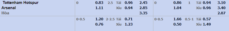 - Mức kèo nhà cái cược chấp trận này: Hòa – Được – Thua. Tottenham Hotspur ăn 0,83. Arsenal ăn 1,11