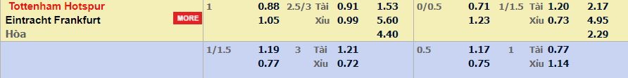 - Mức kèo nhà cái cược chấp trận này: Tottenham chấp 1 trái. Tottenham ăn 0,88. Frankfurt ăn 1,05