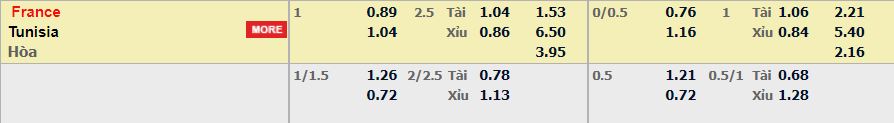 - Mức kèo nhà cái cược chấp trận này: Pháp chấp 1 trái. Pháp ăn 0,89. Tunisia ăn 1,04
