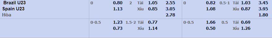- Mức kèo nhà cái đưa ra trận này: Hòa – Được – Thua. U23 Brazil ăn 0,80. U23 Tây Ban Nha ăn 1,13