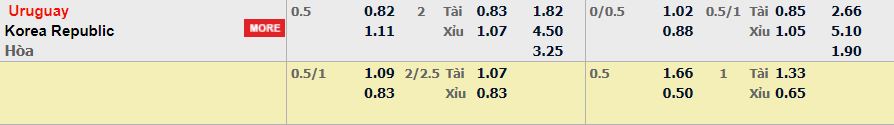 - Mức kèo nhà cái cược chấp trận này: Uruguay chấp 0,5 trái. Uruguay ăn 0,82. Hàn Quốc ăn 1,11