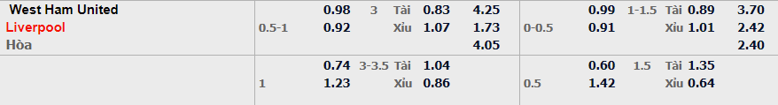 - Mức kèo nhà cái cược chấp trận này: Liverpool chấp 0,75 Trái. West Ham ăn 0,98. Liverpoo ăn 0,92