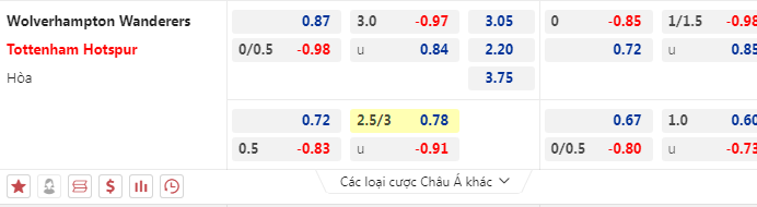- Mức kèo nhà cái cược chấp trận này: Tottenham chấp 0,25 Trái. Wolves ăn 0,87. Tottenham ăn 1,00