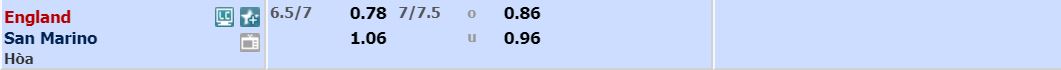 - Mức kèo nhà cái cược chấp trận này: Anh chấp 6,75 Trái. Anh ăn 0,78. San Marino ăn 1,06