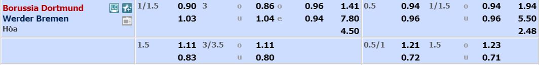 - Mức kèo nhà cái cược chấp trận này: Dortmund chấp 1,25 Trái. Dortmund ăn 0,90. Werder Brêmn ăn 1,03