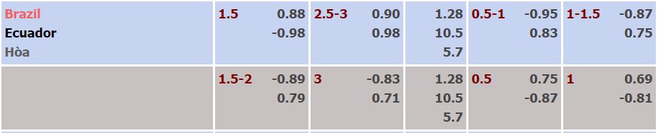 - Mức kèo nhà cái cược chấp trận này: Brazil chấp 1,5 Trái. Brazil ăn 0,88. Ecuador ăn 1,00