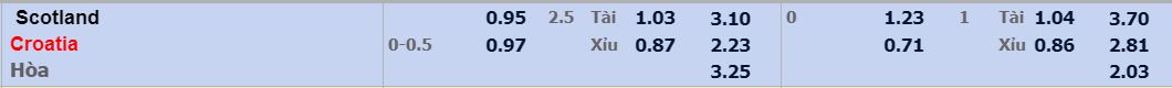 - Mức kèo nhà cái cược chấp trận này: Croatia chấp 0,25 trái. Scotland ăn 0,95. Croatia ăn 0,97