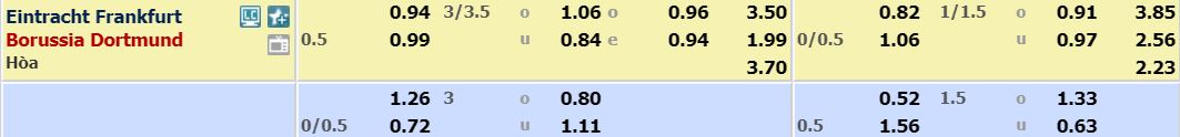 - Mức kèo chấp nhà cái đưa ra cho cả trận: Borussia Dortmund chấp 0,5 trái. Eintracht Frankfurt ăn 0,94. Borussia Dortmund ăn 0,99