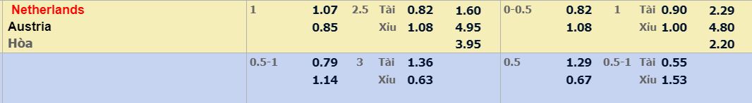- Mức kèo nhà cái cược chấp trận này: Hà Lan chấp 1 trái. Hà Lan ăn 1,07. Áo ăn 0,85
