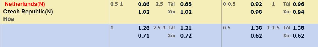 Lịch sử đối đầu trong 2 trận gần nhất đã chứng kiến tổng cộng 7 bàn thắng đã được ghi từ cả 2 đội, đến hiện tại thì phong độ làm bàn của Hà Lan vẫn đang là tốt bậc nhất tại VCK Euro năm nay. Tuy vậy ở phía bên kia, CH Séc đang có phong độ ghi bàn trong 6 trận đấu kể từ đầu năm khá hạn chế với 1,6 bàn mỗi 90’. Với kèo 2,5 thì trong một cuộc đấu tại vòng loại trực tiếp thì nên chọn Xỉu.