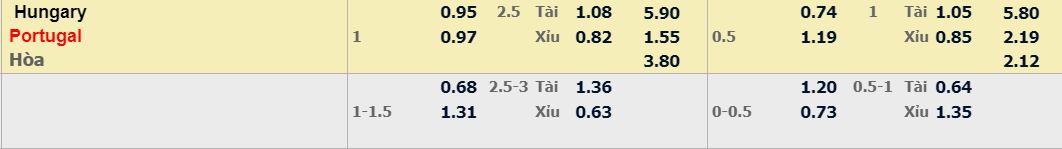 - Mức kèo nhà cái cược chấp trận này: Bồ Đào Nha chấp 1 Trái. Hungary ăn 0,95. Bồ Đào Nha ăn 0,98
