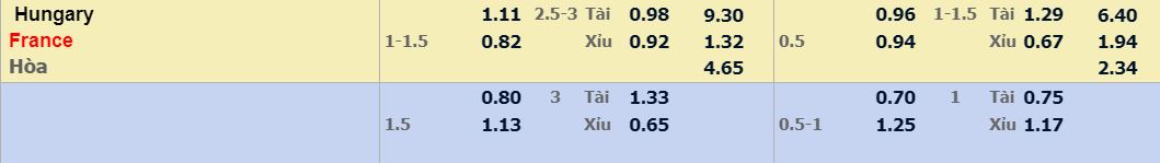 Trong 6 trận đấu đã qua kể từ đầu năm nay, Les Bleus ngoài thành tích bất bại, đã có trung bình 2 bàn thắng mỗi 90 phút trong trận đấu có Pháp. Trong 3 lần chạm trán gần nhất của 2 đội tuyển thì đã có ít nhất 3 bàn thắng được ghi ở mỗi trận đấu. Tất nhiên không thể thi vọng Hungary có được pha lập công nào với hàng công gồm 2 tiền đạo không mấy tiếng tăm của họ. Nếu theo kèo 2,75, nên chọn Tài.