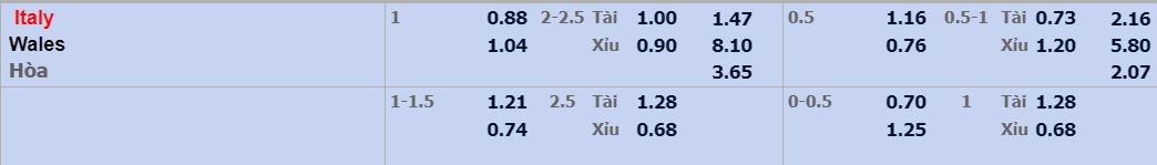 - Mức kèo nhà cái cược chấp trận này: Italy chấp 1 trái. Italy ăn 0,88. Italy ăn 0,88