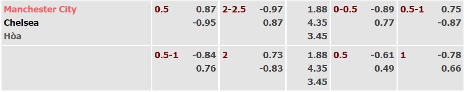- Mức kèo nhà cái cược chấp đưa ra trận này: Manchester City chấp 0,5 Trái. Manchester City ăn 0,87. Chelsea ăn 1,00