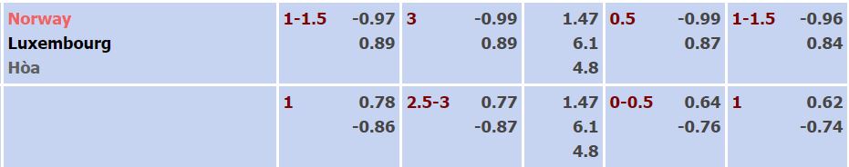 - Mức kèo nhà cái cược chấp trận này: Na Uy chấp 1,25 Trái. Na Uy ăn 1,00. Luxembourg ăn 0,89