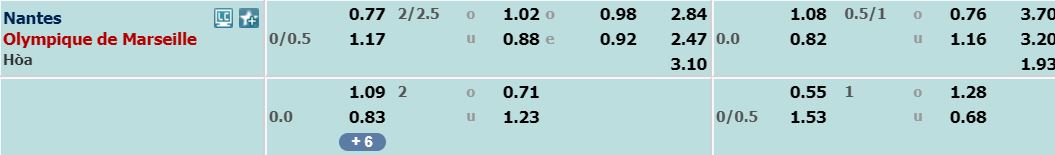 - Mức kèo bóng đá cược chấp nhà cái đưa ra cho cả trận: Olympique Marseille chấp 0,25 Trái. Nantes ăn 0,77. Olympique Marseille ăn 1,17