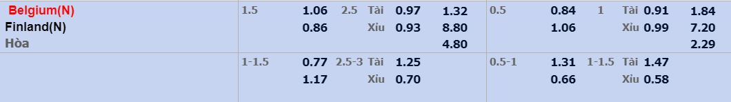 Số bàn thắng trong những trận đấu gần đây của tuyển Phần Lan đang là rất hạn chế, chứng kiến duy nhất 1 lần tổng số bàn thắng trong 1 trận đấu của họ vượt qua mốc 2,5. 5 lần đối đầu gần nhất giữa Bỉ và Phần Lan chứng kiến số bàn thắng trung bình chỉ là 1,4 bàn mỗi 90’. Một thế trận phòng ngự tiêu cực từ phía đội chủ nhà sẽ là kịch bản của trận đấu tới và với kèo 2,5 thì Xỉu sẽ là phương án hợp lý.