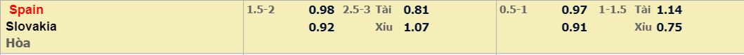 - Mức kèo nhà cái cược chấp trận này: Tây Ban Nha chấp 1,75 trái. Tây Ban Nha ăn 0,98. Slovakia ăn 0,92