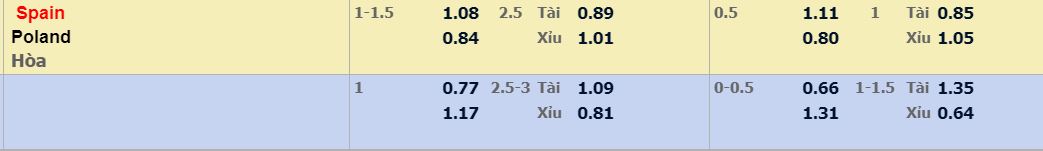 - Mức kèo nhà cái cược chấp trận này: Tây Ban Nha chấp 1,25 trái. Tây Ban Nha ăn 1,08. Ba Lan ăn 0,84