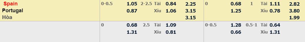 - Mức kèo nhà cái cược chấp trận này: Tây Ban Nha chấp 0,25 Trái. Tây Ban Nha ăn 1,05. Bồ Đào Nha ăn 0,87