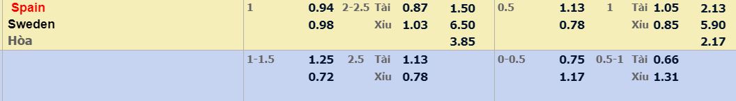 - Mức kèo nhà cái cược chấp trận này: Tây Ban Nha chấp 1 Trái. Tây Ban Nha ăn 0,94. Thụy Điển ăn 0,98