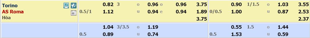 - Mức kèo nhà cái cược chấp trận này: AS Roma chấp 0,75 Trái. Torino ăn 0,82. AS Roma ăn 1,12