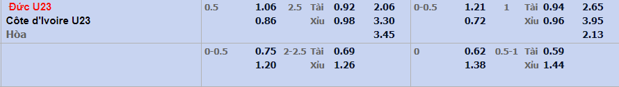 - Mức kèo nhà cái đưa ra trận này: U23 Đức chấp 0,5 trái. U23 Đức ăn 1,06. U23 Bờ Biển Ngà ăn 0,86