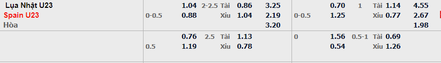 - Mức kèo nhà cái đưa ra trận này: U23 Tây Ban Nha chấp 0,25 trái. U23 Nhật Bản ăn 1,04. U23 Tây Ban Nha ăn 0.88