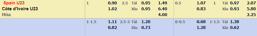 - Mức kèo nhà cái đưa ra trận này: U23 Tây Ban Nha chấp 1 trái. U23 Tây Ban Nha ăn 0,90. U23 Bờ Biển Ngà ăn 1,02