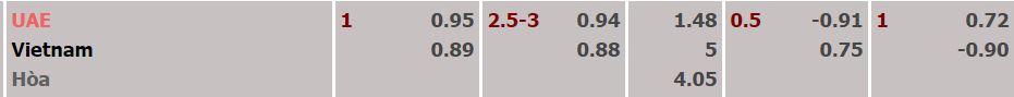 - Mức kèo nhà cái cược chấp trận này: UAE chấp 1 Trái. UAE ăn 0,95. Việt Nam ăn 0,89