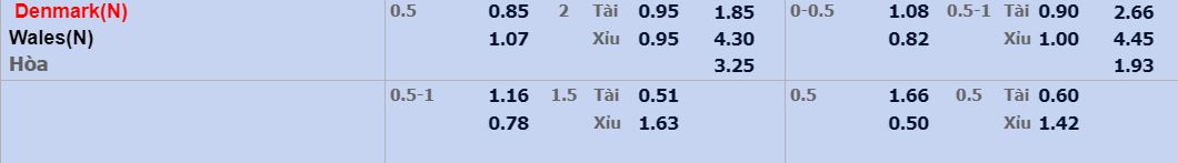 - Mức kèo nhà cái cược chấp trận này: Đan Mạch chấp 0,5 Trái. Đan Mạch ăn 0,85. Wales ăn 1,07