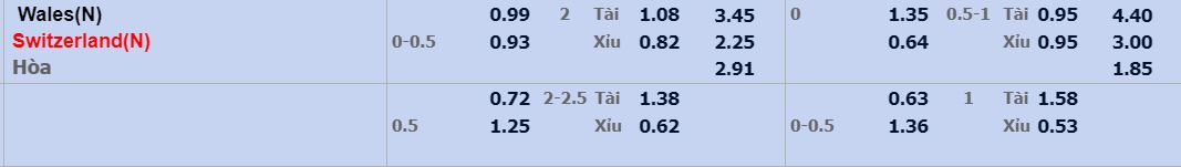 - Mức kèo nhà cái cược chấp trận này: Thụy Sĩ chấp 0,25 Trái. Wales ăn 0,99. Thụy Sĩ ăn 0,93